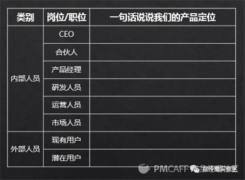 用下面這個簡單的表格,問問包括CEO、合伙人、產(chǎn)品/研發(fā)/運(yùn)營/市場等內(nèi)部工作人員以及現(xiàn)有用戶、潛在用戶,讓他們一句話說說我們的產(chǎn)品是做什么的。