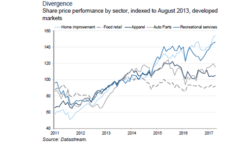 零售商大批破產(chǎn)的同時(shí),一些對(duì)電商“免疫”的行業(yè),在過(guò)去幾年表現(xiàn)卻明顯優(yōu)于其他消費(fèi)類(lèi)行業(yè)。高盛在一篇報(bào)告中總結(jié)了以下四類(lèi):1、線(xiàn)下體驗(yàn)型消費(fèi)(如游樂(lè)場(chǎng));2、“大件”商品和服務(wù)(如家具、教育);3、B2B類(lèi)商品(如工業(yè)零件);4、有監(jiān)管約束的商品(如藥品)。
