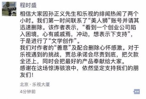 程時盛在朋友圈中寫到:相信大家因?qū)O正義先生和樂視的緋聞熱鬧了兩個小時。我們第一時間聯(lián)系了“美人獅”賬號并請其迅速刪除。該作者表示,“看到一個創(chuàng)業(yè)公司陷入困境,心有戚戚焉,沖動,想表示下支持”,于是進行了“文學(xué)創(chuàng)作”。我們對作者的“善意”及配合刪除心懷感激。對于樂視遇到的挑戰(zhàn),賈總承諾會盡責(zé)到底,把欠款全還上,同時會把最好的產(chǎn)品奉獻給大家。感謝在這場驚濤駭浪中,依然堅定支持我們的朋友們!