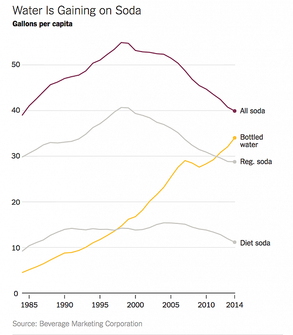 1960年代到1990年代,汽水公司經(jīng)歷過銷售量猛漲。而過去二十年里,汽水在美國的銷量暴跌了將近25%。而行業(yè)調(diào)研機(jī)構(gòu)Beverage Digest最新數(shù)據(jù)顯示,美國汽水2016年的銷量滑入了近31年來的最低谷,較去年銷量又降低了0.8%。