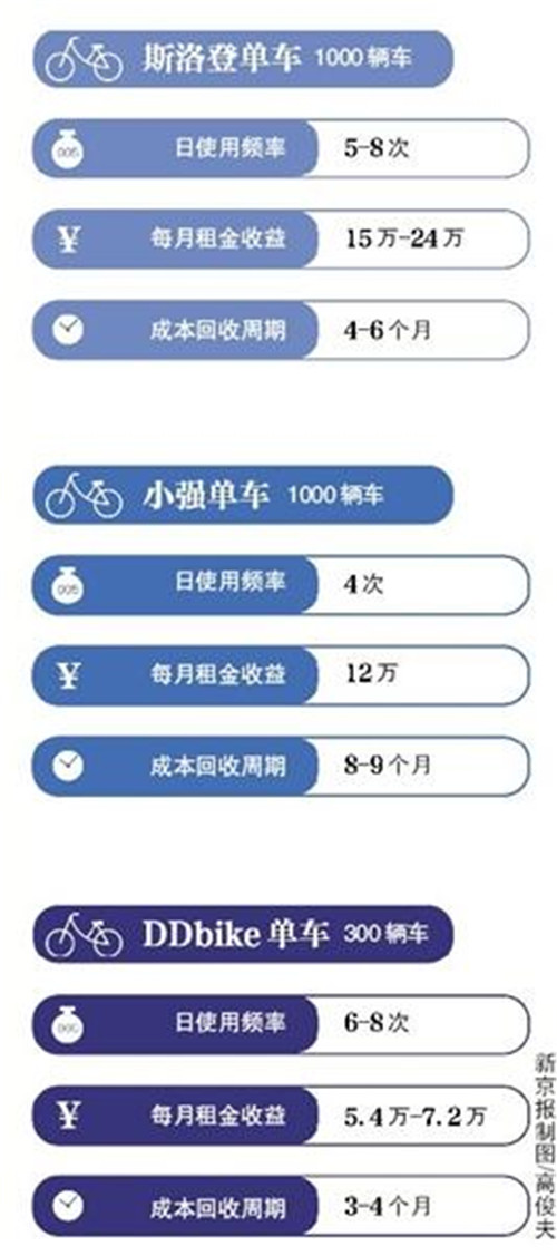 另一個(gè)來(lái)自成都的DDbike則稱,以15萬(wàn)人口的縣城為例,投放300輛車,資金約13.8萬(wàn),客戶端軟件的使用費(fèi)用3萬(wàn),成本總計(jì)18萬(wàn)元,每輛車的日均使用頻率為6-8次,以此計(jì)算3至4個(gè)月就可收回投資本金。