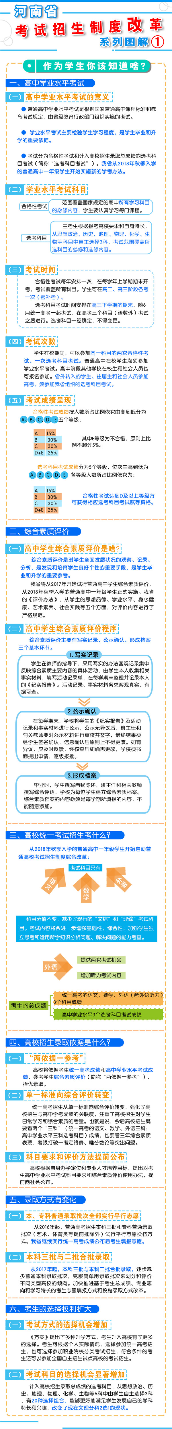 四、改革監(jiān)督管理機制 加強信息公開,全面實施高校招生“陽光工程”,進一步擴大信息公開的范圍和內(nèi)容。強化考試安全,堅持從嚴治考,完善考試招生誠信制度,落實誠信結(jié)果使用要求。加大違規(guī)查處力度,加強考試招生全程監(jiān)管,嚴厲打擊和嚴肅查處考試招生中的違法違規(guī)行為,及時公布查處結(jié)果,嚴格責任追究?! ?strong>五、2018年秋季開始實施 從2018年秋季入學的普通高中一年級學生開始啟動普通高??荚囌猩贫染C合改革?! ≡诟母锟荚嚳颇吭O(shè)置上,不分文理科,外語科目提供兩次考試機會??忌目偝煽冇山y(tǒng)一高考的語文、數(shù)學、外語(含外語聽力)3個科目成績和高中學業(yè)水平3個選考科目考試成績組成。保持統(tǒng)一高考的語文、數(shù)學、外語分值不變。 在改革招生錄取機制上,推進基于統(tǒng)一高考成績和高中學業(yè)水平考試成績、參考學生綜合素質(zhì)評價的多元錄取機制改革。高校要根據(jù)自身辦學定位和專業(yè)人才培養(yǎng)目標,提出對考生高中學業(yè)水平考試科目要求和綜合素質(zhì)評價使用辦法,提前向社會公布?! ?016年省教育行政部門出臺普通高中學業(yè)水平考試實施辦法和普通高中學生綜合素質(zhì)評價實施辦法,從2018年秋季入學的普通高中一年級學生開始正式實施。