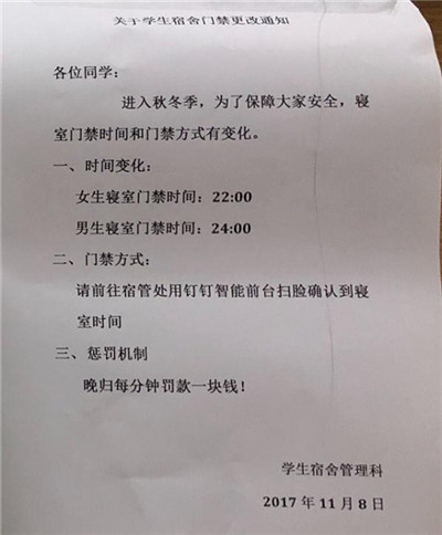 近日,有杭州某高校學(xué)生爆料,杭州某大學(xué)宿舍管理處為管理學(xué)生寢室門禁,引入人臉識別簽到,要求女生在晚上10點(diǎn)前回宿舍,晚到一分鐘罰款1塊錢,而男生竟然可以晚兩小時。