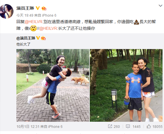 看到這一對(duì)高顏值的母子后,網(wǎng)友留言表示羨慕,但有人卻在微博下辱罵到:“長(zhǎng)大了還不讓他x你?!贝藲^評(píng)論也惹怒王琳。