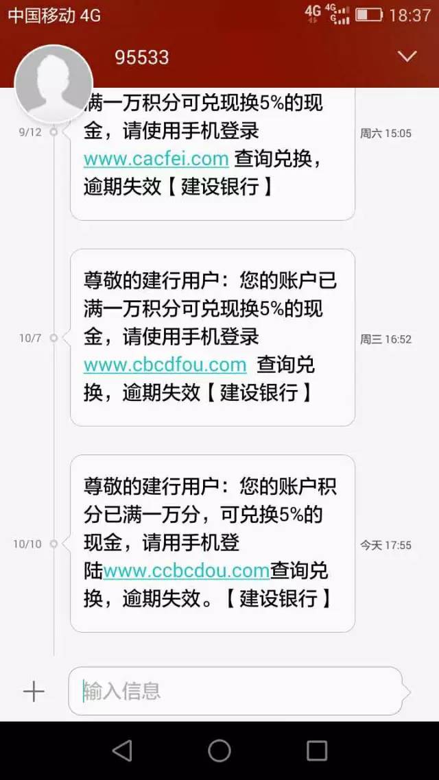 9月24日,受害人尹某,收到來自95533兌換建行賬戶積分的詐騙短信,點(diǎn)擊釣魚網(wǎng)站鏈接操作后被轉(zhuǎn)賬騙走5000元。9月28日,受害人盧某,收到95533兌換建行積分詐騙短信,點(diǎn)擊釣魚網(wǎng)站鏈接操作后被轉(zhuǎn)賬騙走3900元。