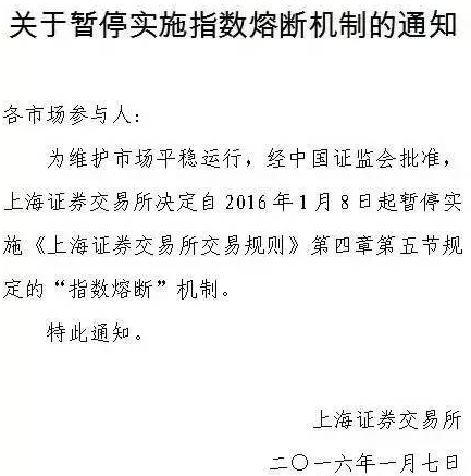 1月7日當晚,上交所、深交所及中金所聯(lián)合發(fā)布通知稱決定暫停實施制度熔斷機制?!敖?jīng)中國證監(jiān)會同意,上交所、深交所及中金所決定于1月8日起暫停實施指數(shù)熔斷相關(guān)規(guī)定。”