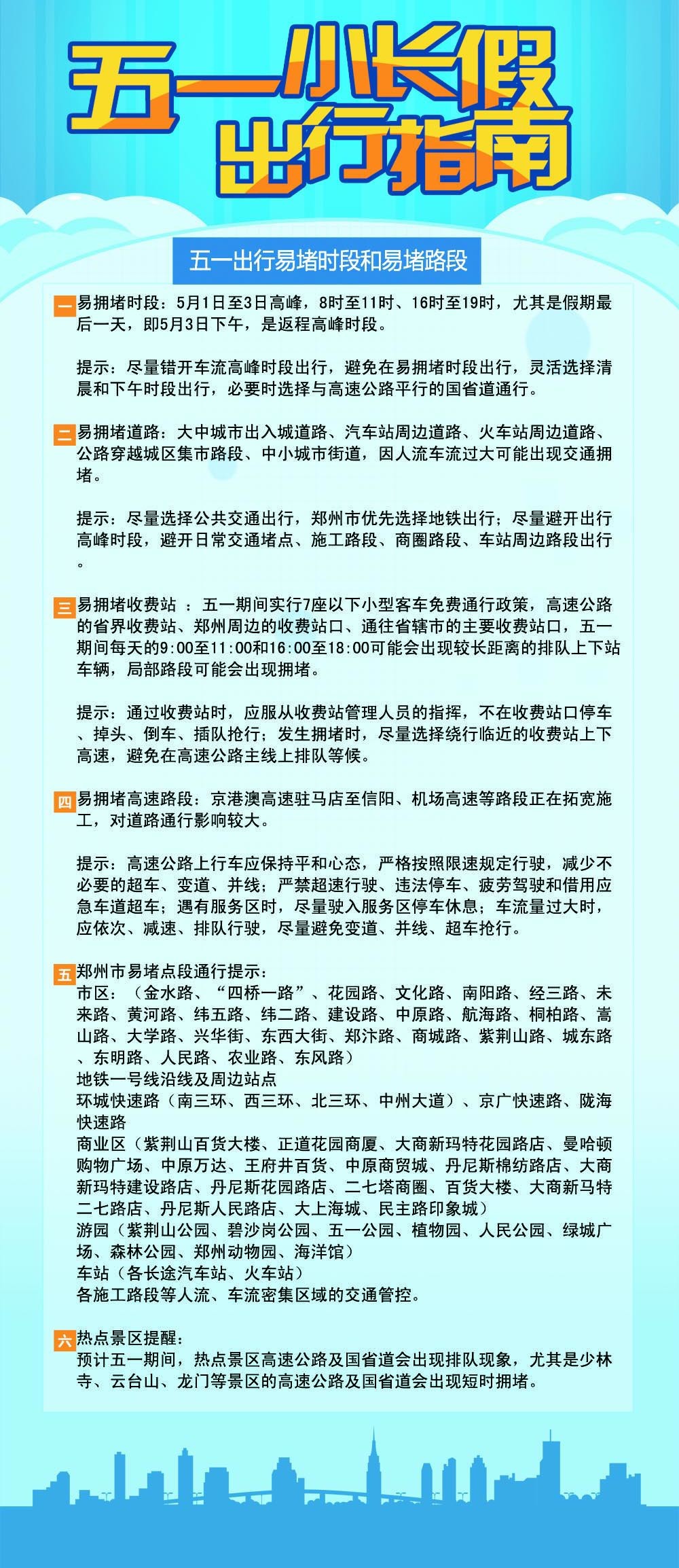盡量避開假期第一天和最后一天的8時至11時、16時至19時兩個高峰時段,特別是假期最后一天5月3日下午是返程高峰時段。