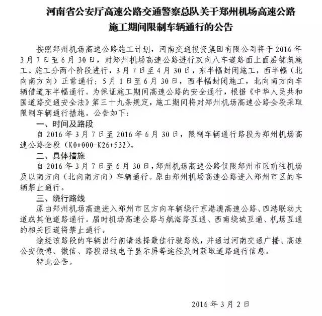 自2016年3月7日至6月30日,鄭州機(jī)場(chǎng)高速公路僅限鄭州市區(qū)前往機(jī)場(chǎng)及以南方向(北向南方向)車(chē)輛通行。原由鄭州機(jī)場(chǎng)高速公路進(jìn)入鄭州市區(qū)的車(chē)輛禁止通行。