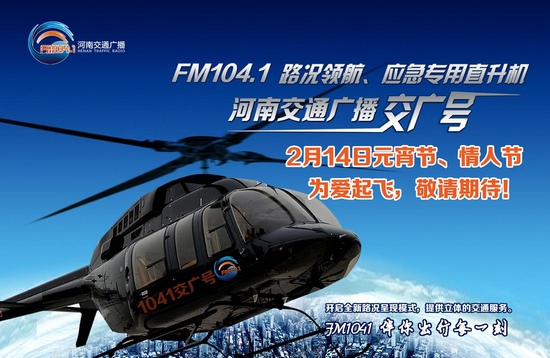 2月14日,河南交通廣播將送來(lái)“中西合璧情人節(jié)”重磅大禮——“向愛說(shuō)sorry”交廣號(hào)私人定制浪漫情人節(jié)。當(dāng)天,1041交廣號(hào)直升機(jī)將再次為愛起飛,全景呈現(xiàn)省會(huì)鄭州交通路況,并聯(lián)合二七萬(wàn)達(dá)廣場(chǎng),提供情人節(jié)私人專機(jī)浪漫飛行,現(xiàn)在參與河南交通廣播節(jié)目微信互動(dòng),就有機(jī)會(huì)和你的TA坐上1041交廣號(hào)專機(jī),獨(dú)享二人世界,不妨來(lái)一場(chǎng)浪漫的空中求婚儀式。