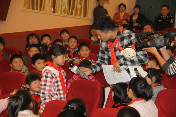 活動現(xiàn)場信息廣播主持人張東為答對問題的小學生派送禮物