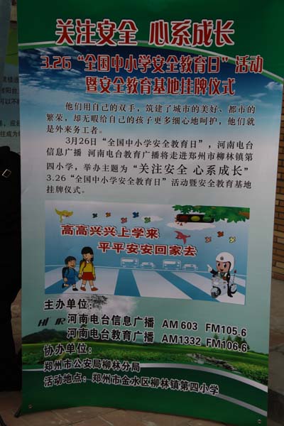 2012年3月26日是第十七個“全國中小學安全教育日”,在教育日當天舉行“中小學安全教育基地”掛牌儀式,河南電臺信息廣播依托日常欄目《法制新河南》的整合資源,將中小學安全宣傳教育常態(tài)化。據(jù)河南電臺信息廣播總監(jiān)李金鋒介紹,“教育基地建立以后,河南電臺信息廣播將聯(lián)合鄭州市公安局柳林分局,通過信息廣播AM603、FM105.6廣播頻率,以《法制新河南》欄目為陣地,長期持久的宣傳中小學安全教育知識,并為柳林鎮(zhèn)第四小學的學生提供書籍、器械等安全教育的物品,節(jié)目主持人和柳林分局的警官還將不定期的深入校園內(nèi),跟學生們面對面的交流、一對一的輔導?!?br />