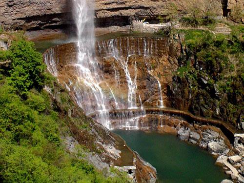 紅石河碧水橫溢、紅綠相映、色彩斑斕、明麗如畫,因海拔1100米被譽(yù)為“太行天河”。從紅石河畔俯瞰,山谷幽深、流水潺潺,河水順著光潔平整、錯(cuò)落有致的紅石板流淌不息,直沖而下形成又一著名景點(diǎn)——天河大瀑布。紅石河的右畔是觀音洞,觀音洞里的泉水常年不斷、甘甜可口,用來(lái)泡茶增三分香,煮飯?jiān)黾尤痔?,現(xiàn)在敞開供應(yīng),保你一杯解風(fēng)塵,二杯去疲乏,三杯大汗落。 八里溝的山,八里溝的水,甚至八里溝的每一塊石頭都引起世界的好奇。景區(qū)森林覆蓋率達(dá)90%,如今,八里溝景區(qū)已經(jīng)成為國(guó)內(nèi)很多前衛(wèi)、時(shí)尚的游客非常向往的一個(gè)人間天堂、世外桃源,也是春季旅游的經(jīng)典線路。
