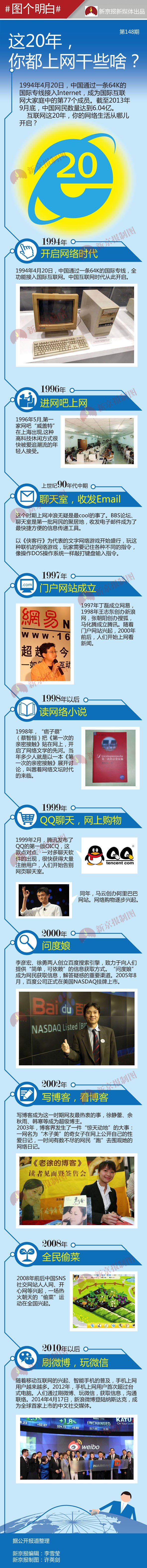 1994年4月20日,中國通過一條64K國際專線接入Internet,成為國際互聯(lián)網(wǎng)大家庭中的第77個成員。截至2013年9月底,中國網(wǎng)民數(shù)量達(dá)到6.04億。互聯(lián)網(wǎng)這20年,你的網(wǎng)絡(luò)生活從哪兒開啟?