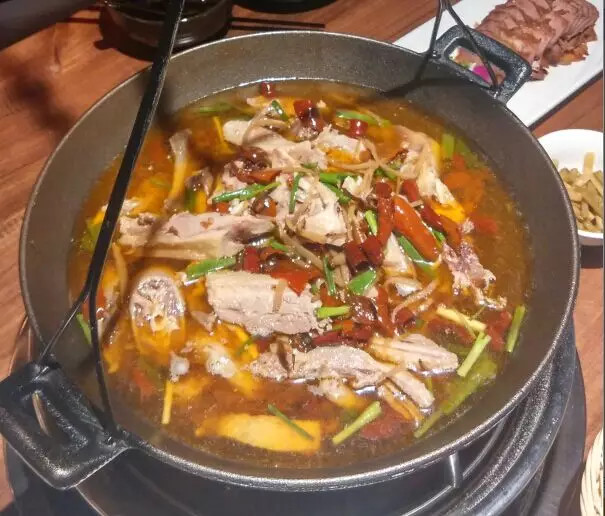 這鍋也不是普通鍋,必是生鐵的才好,一是厚重,鍋不會(huì)亂動(dòng),二是健康,補(bǔ)鐵補(bǔ)血,比廣告強(qiáng)。鍋內(nèi)放信陽(yáng)老燉菜,老公雞、排骨、豬蹄、鵝塊,時(shí)間越久越有味。如果是冬天,“新醅酒,小火爐,天欲雪,一杯無(wú)”意境太贊,要是夏天,“炭火燒,大汗淌,赤膊上,可勁浪”,警察叔叔也管不著~~