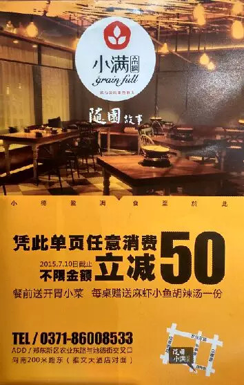 還未正式營(yíng)業(yè),憑此微信進(jìn)店消費(fèi)不限金額,立減50元,還有小菜相送,截止日期7月10日!