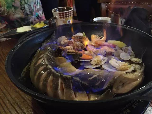 以魚(yú)、扇貝、大蝦和時(shí)蔬為鍋底,先燜制,后以米酒澆鍋,點(diǎn)火后,能看到火焰在食材上跳躍,聞到淡淡的酒香,最后的醬料可以拌意面吃,有黑椒、麻辣和酸菜三種口味。