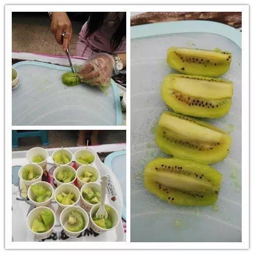 看我們兩位小小志愿者,把新鮮美味的獼猴桃送給小區(qū)的居民品嘗。