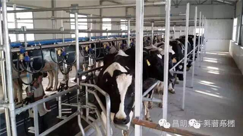 產(chǎn)奶期的奶牛從自己的牛舍成群結(jié)隊的有序步入擠奶廳,進入擠奶廳后,每只奶牛都要先洗澡,然后人工擠掉前三把牛奶,裝好擠奶器,牛奶就從奶牛的體內(nèi)經(jīng)管道直接進入冷藏罐了。我們可以站在觀景平臺上,透過高清玻璃,可以清楚的看到擠奶廳內(nèi)奶牛排隊擠奶的壯觀場景。