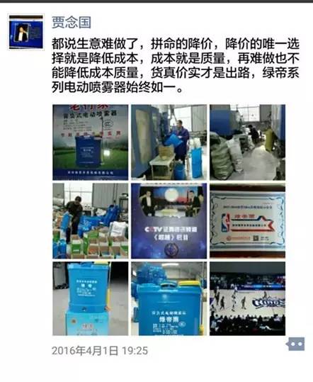 任何一名企業(yè)家,都有困惑的時候。開始的時候,生產電動噴霧器的公司也就只有他這一家,如今在河南省內達到了100多家,全國的生產廠家有1000多家,賈總覺得目前市場競爭是比較激烈的,仿造的甚至是假冒的產品還時有出現(xiàn);產品的利潤也沒有以前高了;隨著原材料及工人工資等成本的增加,批發(fā)價格也有所調高;這一點,有時在賈總的微信里也看出了一些無奈和感慨。