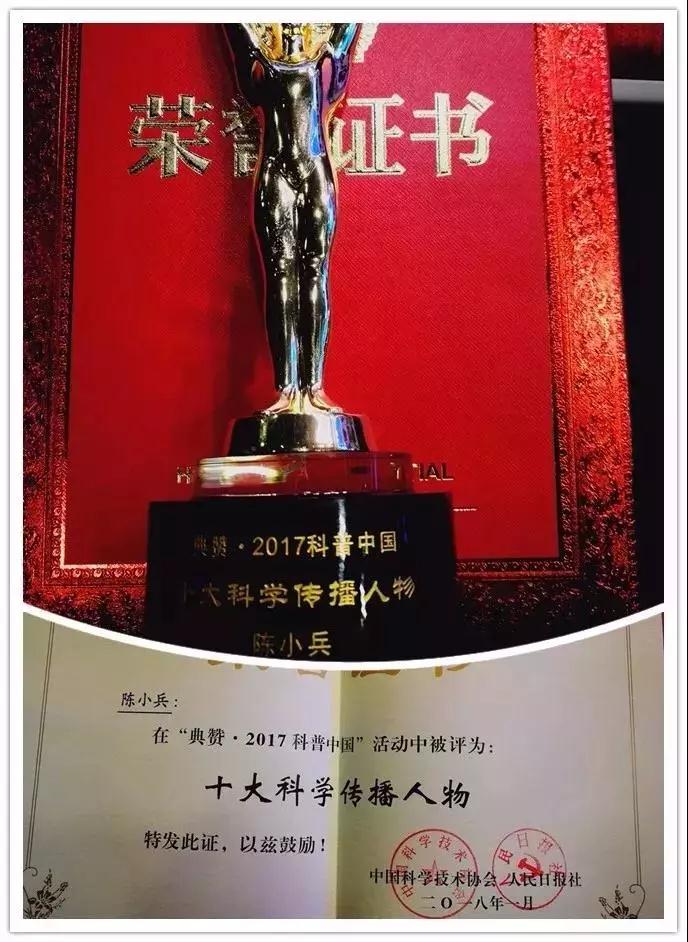 陳小兵當(dāng)選“2017年十大科學(xué)傳播人物”,組委會(huì)給予他的頒獎(jiǎng)詞是,在緊張的臨床工作之余,他熱心醫(yī)學(xué)科普,下基層、走街道、進(jìn)校園、入社區(qū),腳步走遍中原,做科普講座300余場(chǎng),受眾十余萬(wàn)人,積極推廣“預(yù)防為主”的防癌理念,為腫瘤科普殫精竭慮,被譽(yù)為“中原腫瘤科普第一人”。
