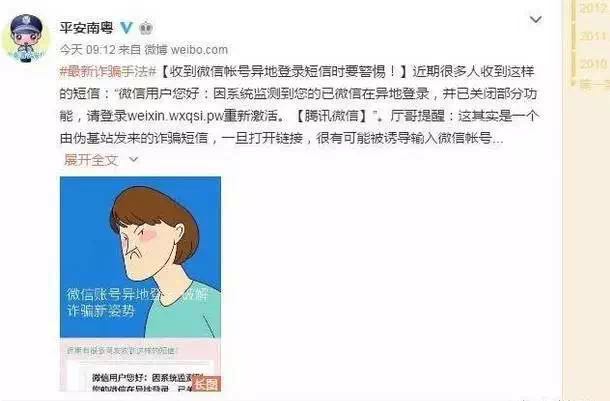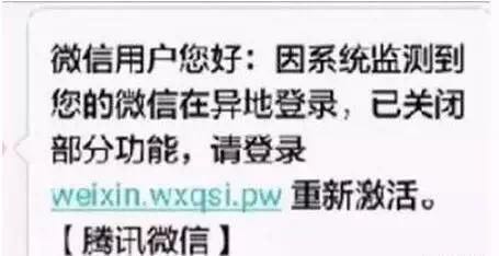 #最新詐騙手法#【收到微信帳號(hào)異地登錄短信時(shí)要警惕!】近期很多人收到這樣的短信:“微信用戶(hù)您好:因系統(tǒng)監(jiān)測(cè)到您的已微信在異地登錄,并已關(guān)閉部分功能,請(qǐng)登錄weixin.wxqsi.pw重新激活。【騰訊微信】”。廳哥提醒:這其實(shí)是一個(gè)由偽基站發(fā)來(lái)的詐騙短信,一旦打開(kāi)鏈接,很有可能被誘導(dǎo)輸入微信帳號(hào)、微信密碼、支付密碼、驗(yàn)證碼等,后果不堪設(shè)想……