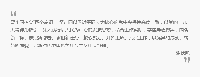 謝伏瞻說(shuō),黨的十九屆一中全會(huì)選舉習(xí)近平同志為黨的總書(shū)記,這是全黨全國(guó)各族人民的共同心愿,習(xí)近平總書(shū)記是全黨擁護(hù)、人民愛(ài)戴、當(dāng)之無(wú)愧的黨的領(lǐng)袖。大家要切實(shí)增強(qiáng)“四個(gè)意識(shí)”,同以習(xí)近平同志為核心的黨中央保持高度一致。中國(guó)特色社會(huì)主義進(jìn)入了新時(shí)代,這是一個(gè)重大的政治判斷,為我們國(guó)家發(fā)展標(biāo)明了準(zhǔn)確的歷史坐標(biāo)和發(fā)展方位。