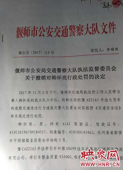 17日下午13時(shí)許,在廣電南路上,法制科黎科長(zhǎng)和督察李警官帶著“偃師市公安局交警大隊(duì)執(zhí)法監(jiān)督委員會(huì)關(guān)于撤銷對(duì)韓懷亮行政處罰的決定”文件與韓先生見(jiàn)面。