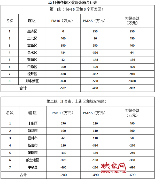 在對鄭州市環(huán)境空氣質(zhì)量進行的“考試”的基礎上,實行獎懲制度,有獎也有罰,客觀科學地對市區(qū)空氣質(zhì)量進行的監(jiān)督考察。對每周的空氣質(zhì)量排名獎懲以及獎懲金額進行公示,獎罰透明、看得見。本月累計2周排名倒數(shù)第一并對其進行全市通報批評的為鄭東新區(qū)、經(jīng)開區(qū)、中牟縣、新密市。