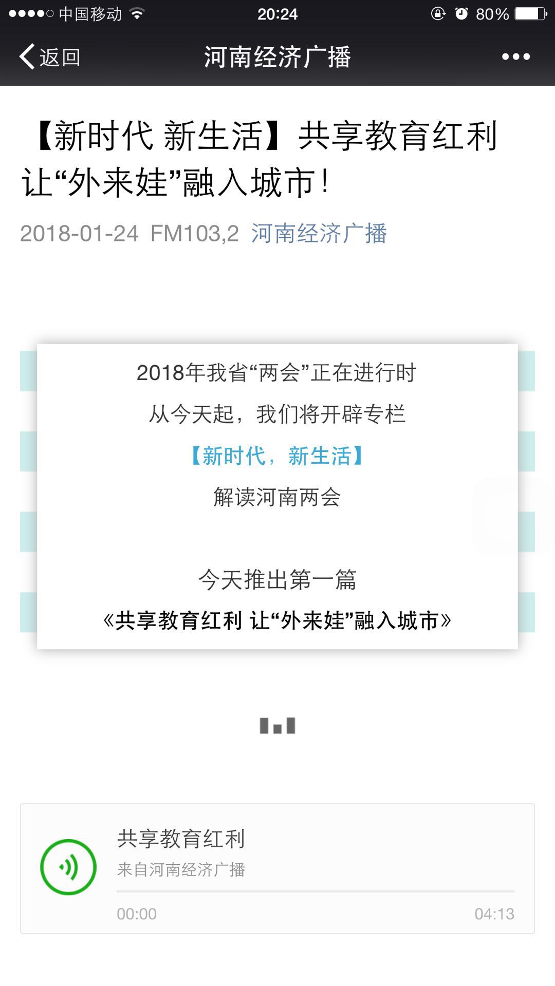 河南經(jīng)濟(jì)廣播推出兩會專欄“新時(shí)代  新生活”,推出五篇深度報(bào)道:《共享教育紅利  讓“外來娃”融入城市!》、《藍(lán)天白云下的大數(shù)據(jù)“護(hù)衛(wèi)隊(duì)”!》、《讓家庭醫(yī)生打通分級診療“最后一公里”》、《加大住房保障力度,圓百姓安居夢!》、《扎根中原大地,“創(chuàng)”出美好未來!》,總時(shí)長25分鐘。這一組報(bào)道用“講故事說新聞”的方式,關(guān)注隨遷子女享有與城市學(xué)生一樣的高品質(zhì)教育、環(huán)保技術(shù)革新、返鄉(xiāng)下鄉(xiāng)創(chuàng)業(yè)扶貧、保障房建設(shè)、生態(tài)文明等熱點(diǎn)民生話題,每期采訪都做到聲音全面、數(shù)據(jù)詳實(shí)、人物典型、立意深遠(yuǎn),通過對代表、委員建議、對話部門、基層聲音等四個(gè)方面,對熱點(diǎn)話題報(bào)道做到有“廣度 高度 深度 溫度”。