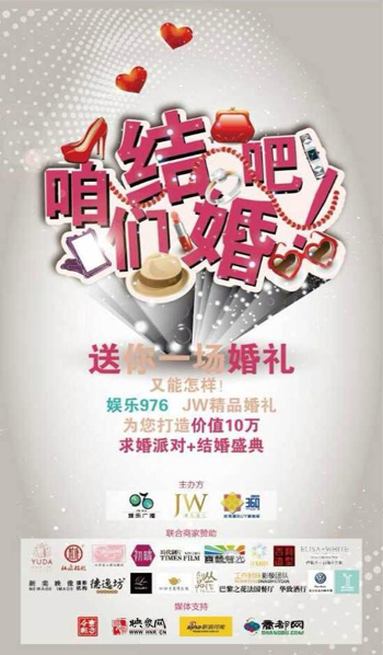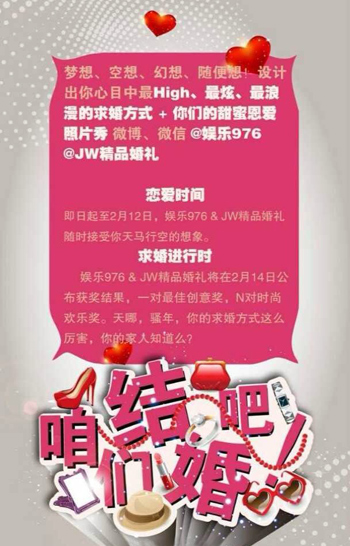 2月12日娛樂976全新上線,我們?yōu)槟蛟煲粓鰪V播史上最時尚最浪漫的求婚派對+結(jié)婚盛典!只要心中有愛,求婚方式可以多姿多彩,怎樣的求婚才能讓她難忘、心甘情愿說“I do!”?現(xiàn)在,只要有創(chuàng)意的求婚方式,就可以獲得10萬元求婚+結(jié)婚盛典!求婚,你準(zhǔn)備好了嗎?咱們結(jié)婚吧!