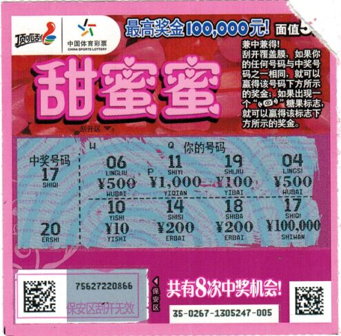 彩民王先生是一位運(yùn)動(dòng)達(dá)人,平時(shí)喜歡夜跑鍛煉身體,連續(xù)兩個(gè)星期的陰雨天終于放晴,王先生非常興奮的去夜跑,途中看到一家體育彩票店干凈整潔,明亮熱鬧。王先生發(fā)現(xiàn)很多彩民圍在桌子旁刮即開彩票,便跟老板咨詢,當(dāng)了解到即開彩票能即刮、即兌、當(dāng)場(chǎng)開獎(jiǎng),就報(bào)著試試手氣的想法選了面值5元的“甜蜜蜜”彩票。滿滿的愛心,粉紅的主色調(diào)看上去很溫暖很舒服。刮著第一張的覆蓋面的最后一個(gè)號(hào)碼,王先生發(fā)現(xiàn)中獎(jiǎng)號(hào)碼區(qū)的“17”和你的號(hào)碼區(qū)的“17”完全一致,再刮開金額100000元,哇!10萬元頭獎(jiǎng)呈現(xiàn)眼前!一邊兌獎(jiǎng)王先生一邊激動(dòng)的說“幸運(yùn)中大獎(jiǎng),很開心!熱愛體育運(yùn)動(dòng),支持體育彩票!”