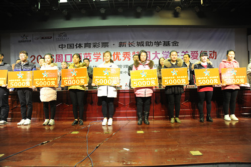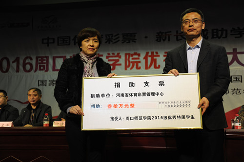2016年12月7日、8日,中國體育彩票品牌公益項目“中國體育彩票新長城助學(xué)基金”2016年捐贈儀式分別在商丘師范學(xué)院和周口師范學(xué)院舉行。據(jù)悉,通過此次捐贈活動,河南省體育彩票管理中心共向兩個學(xué)校來自全國14省區(qū)的120名優(yōu)秀貧困大學(xué)生每人捐助5000元,幫助他們和他們的家庭,減輕學(xué)習(xí)生活中的經(jīng)濟負擔。