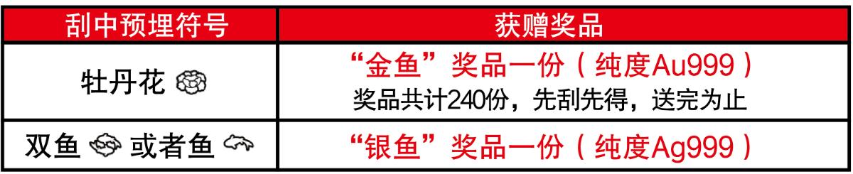 活動期間,彩民在我省任一體彩銷售網(wǎng)點購買30元面值“富貴有余”主題即開票,若單張彩票刮出符合獎勵條件的預(yù)埋符號,并經(jīng)兌獎設(shè)備(IVT或BCR等)完成掃描確認(rèn)(促銷兌獎)且剪角處理后,即可獲贈精美獎品一份,詳見下表: