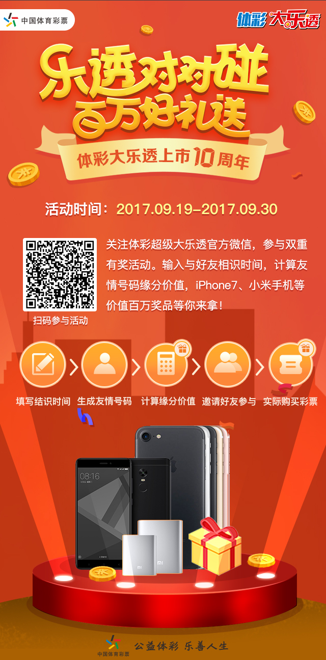本次活動(dòng)于2017年9月19日至30日在體彩超級(jí)大樂(lè)透官方微信進(jìn)行?;顒?dòng)以體彩大樂(lè)透10周年為背景,以“友誼”為主題,采用線上、線下相結(jié)合的活動(dòng)方式,為彩友們提供了雙重好禮?;顒?dòng)期間,彩友們只要關(guān)注體彩超級(jí)大樂(lè)透官方微信,點(diǎn)擊底部“樂(lè)透有禮”菜單即可進(jìn)入活動(dòng)頁(yè)面,或掃描活動(dòng)二維碼直接進(jìn)入頁(yè)面參與。在活動(dòng)首頁(yè)點(diǎn)擊“碰碰運(yùn)氣”,輸入與好友的相識(shí)時(shí)間,根據(jù)相關(guān)信息生成一注緣分號(hào)碼?;顒?dòng)根據(jù)緣分號(hào)碼10年來(lái)歷史累計(jì)中獎(jiǎng)獎(jiǎng)金進(jìn)行排行,每日根據(jù)排行榜派發(fā)相應(yīng)獎(jiǎng)品。同時(shí),彩友們還可在每周一、三、六體彩大樂(lè)透開(kāi)獎(jiǎng)當(dāng)期,到線下體彩投注站購(gòu)買自己相應(yīng)的緣分號(hào)碼,并通過(guò)活動(dòng)平臺(tái)上傳該注號(hào)碼的彩票序列號(hào)贏取更多獎(jiǎng)品。