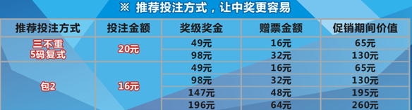 贈票活動不限投注方式,單式、復式、組合如中獎均可贈票。采用復式組合投注,獎金有可能會翻2倍、3倍或4倍,是真正的獎金會翻倍的彩票,尤其是現(xiàn)在活動升級,贈票金額翻倍,獎金更高更超值。