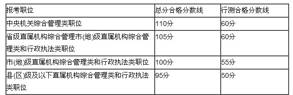 其中,報考中央機(jī)關(guān)綜合管理類職位的合格分?jǐn)?shù)線較去年相比有所提高,總分不低于110分,且行政職業(yè)能力測驗不低于60分。分?jǐn)?shù)線劃定如下表: