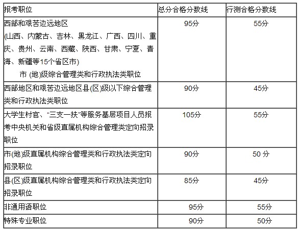 其中,西部地區(qū)和艱苦邊遠(yuǎn)地區(qū)綜合管理類和行政執(zhí)法類職位的合格分?jǐn)?shù)線總分不低于95分,且行測不低于55分。非通用語職位的合格分?jǐn)?shù)線總分不低于95分,且行測不低于55分。特殊專業(yè)職位的合格分?jǐn)?shù)線總分不低于90分,且行測不低于50分。銀監(jiān)會、證監(jiān)會特殊專業(yè)職位專業(yè)科目考試不低于50分。