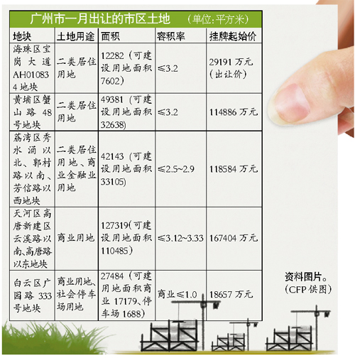 而根據(jù)以往數(shù)據(jù),廣州1月底即將入市的土地達(dá)到7宗,總起拍價(jià)高達(dá)55.8億元,其中有五宗地位于中心城區(qū),備受關(guān)注。記者發(fā)現(xiàn),去年1月廣州土地出讓金僅為13.6億元。若以起拍價(jià)計(jì)算,廣州今年1月拍地收入將達(dá)到去年同期4倍。
