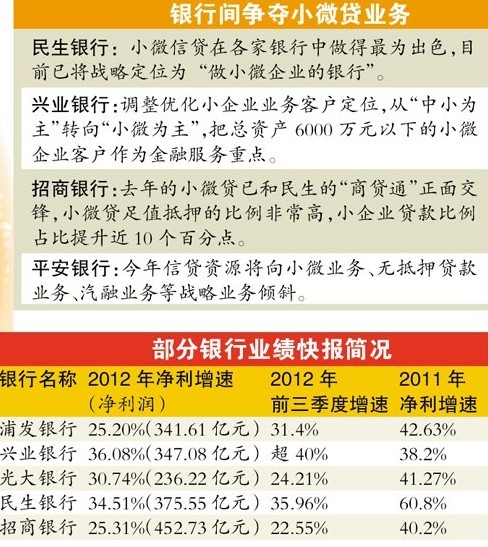 其中一個(gè)重要的對(duì)手將是興業(yè)銀行。興業(yè)銀行昨日披露,2013年,興業(yè)銀行積極調(diào)整優(yōu)化小企業(yè)業(yè)務(wù)客戶(hù)定位、經(jīng)營(yíng)戰(zhàn)略和發(fā)展目標(biāo),將總資產(chǎn)6000萬(wàn)元以下的小微企業(yè)客戶(hù)作為金融服務(wù)重點(diǎn),并配套實(shí)施一系列體制機(jī)制改革措施和投入資源保障,全面推進(jìn)小微企業(yè)金融服務(wù)升級(jí)。