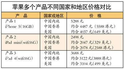 另外,剛剛上市的iPad mini,其wifi版的16G在美國市場僅為2047人民幣(329美元),大大低于中國內地市場同款式的2498元人民幣。即使與前幾代價格沒有變化的ipad 4,其16G的wifi版在美國也只要3104元人民幣(499美元),中國香港市場為3122元人民幣(3888港元),而中國內地市場卻要3688元人民幣。