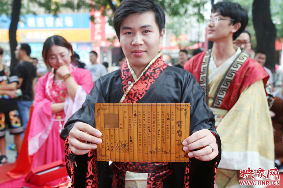 下午17點(diǎn)30分,鄭州二七廣場附近的一處小廣場前熱鬧非凡,8對年輕男女身著古裝,參加愛的“賣身契”簽約儀式。