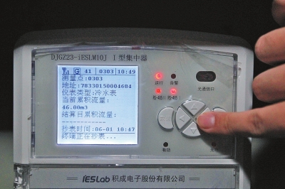10時(shí)49分,在33樓的電井房內(nèi),操作員正在調(diào)試集中器。記者看到,集中器的電子屏顯示最近一次抄表內(nèi)容為:10時(shí)47分,冷水表,當(dāng)前流量46立方米。