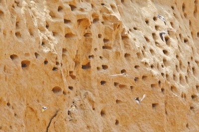 記者在現(xiàn)場看到,堆壁上崖沙燕的小洞穴似拳頭大小,密密麻麻,難以數(shù)清。天空中,不少小燕子正在“苦練”飛翔,嘰嘰喳喳的鳴叫聲此起彼伏;洞穴里,嗷嗷待哺的燕寶寶好奇地伸頭張望,透過攝影記者的長鏡頭,記者觀察到,好多洞穴內(nèi)還有燕子喂食小燕的暖心畫面。