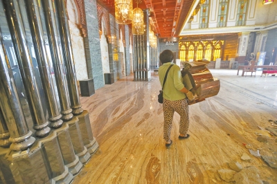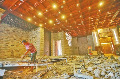 大廳內(nèi),金碧輝煌的樓頂和墻體以及各種燈飾等都還沒(méi)有拆除,大廳東側(cè)的一處1尺高的平臺(tái)正在拆除。在切割、拉扯、裝卸等雜音交響中,東北角一名工人拿著大錘對(duì)著室內(nèi)非承重墻猛砸,已砸出一個(gè)大窟窿。很顯然,這里正進(jìn)行大規(guī)模拆除。