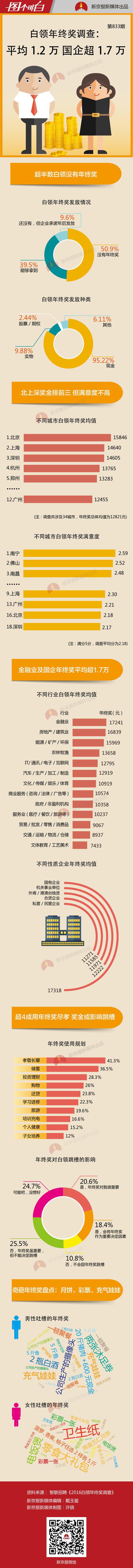 春節(jié)將至,“年終獎(jiǎng)”又成了眾人關(guān)注的話題。近日,智聯(lián)招聘發(fā)布《2016白領(lǐng)年終獎(jiǎng)?wù){(diào)查》,調(diào)查通過對11526份有效問卷分析顯示,涉及的34城市年終獎(jiǎng)總體均值為12821元。其中,北京最高,為15846元,上海和深圳次之。不過,三個(gè)城市的白領(lǐng)對年終獎(jiǎng)的滿意度并不是很高。