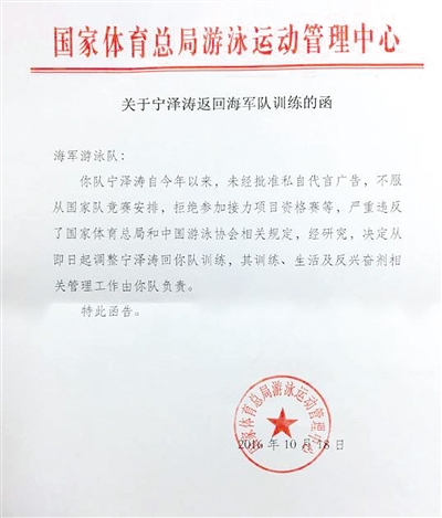 日前有媒體報道寧澤濤離隊的消息,并附有國家體育總局游泳運動管理中心內(nèi)部文件的照片,文件內(nèi)容為:“海軍游泳隊:你隊寧澤濤今年以來,未經(jīng)批準(zhǔn)私自代言廣告,不服從國家隊競賽安排,拒絕參加接力項目資格賽,嚴(yán)重違反了國家體育總局和中國游泳協(xié)會相關(guān)規(guī)定,經(jīng)研究,決定從即日起調(diào)整寧澤濤回你隊訓(xùn)練,其訓(xùn)練、生活及反興奮劑相關(guān)管理工作由你隊負責(zé)。特此函告。”時間落款為2016年10月18日。
