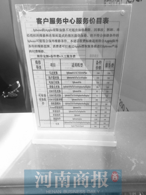 價(jià)目表顯示,維修項(xiàng)目有11項(xiàng),價(jià)格與正規(guī)蘋(píng)果售后基本一致。