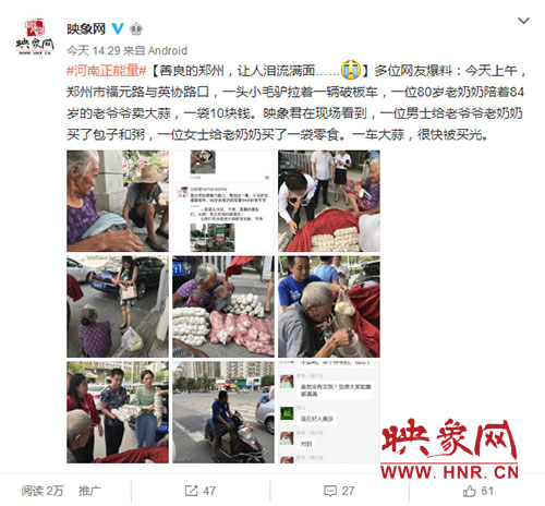 映象網(wǎng)快訊(記者 王寬 趙輝 實習(xí)生 張璨榮 文/圖)“我能想到最浪漫的事,就是和你一起慢慢變老……”8月23日中午,鄭州街頭上演暖心一幕,年過八旬的中牟老農(nóng)趕著毛驢車?yán)习檫M城賣大蒜,一車蒜被搶購一空,卻裝滿了鄭州愛心市民送的食物。