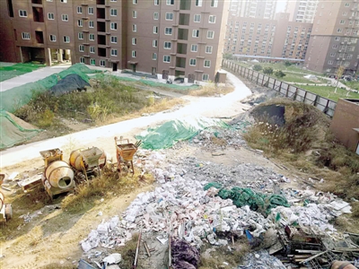 王女士介紹他們小區(qū)是清華·紫光園一期,與二期工地僅一墻之隔。8號樓從二樓起就能看到下面的工地,窗戶朝南原本是個好方向,冬天太陽可以曬到屋里來,還可以經(jīng)常開窗通風(fēng)。但因樓下工地垃圾成堆,樓上的住戶都不敢輕易開窗,經(jīng)常有各種惡臭飄進(jìn)房間。