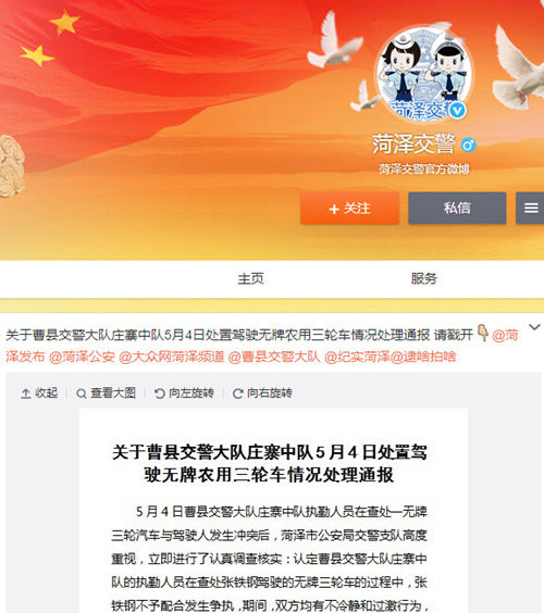 針對此事,菏澤交警表示,5月4日曹縣交警大隊莊寨中隊執(zhí)勤人員在查處一無牌三輪汽車與駕駛?cè)税l(fā)生沖突后,菏澤市公安局交警支隊高度重視,立即進(jìn)行了認(rèn)真調(diào)查核實。調(diào)查認(rèn)定,曹縣交警大隊莊寨中隊執(zhí)勤人員在查處張鐵鋼駕駛的無牌三輪車的過程中,由于張鐵鋼不予配合發(fā)生爭執(zhí),爭執(zhí)期間雙方均有不冷靜和過激行為,并發(fā)生肢體沖突,在社會上造成了不良影響。決定對曹縣交警大隊分管中隊的負(fù)責(zé)人石保安警誡一次、通報批評;給予曹縣交警大隊莊寨中隊中隊長黃鳳春行政警告處分,予以免職;給予涉事協(xié)警辭退處理。